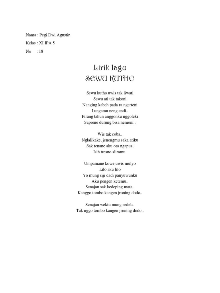 Arie wibowo menyanyikannya dalam bahasa indonesia, sementara didi kempot membawakannya dalam bahasa jawa. Simak uraian berisi lirik, terjemahan, dan makna di balik lagu sewu kutho. Tak perlu khawatir, karena di bawah ini juga disediakan terjemahannya di dalam bahasa indonesia: Tapi sama godfather of brokenheart didi kempot dipopulerkan kembali dalam bahasa jawa dan . Hafal liriknya dan tahu artinya jika diterjemahkan ke dalam bahasa indonesia.